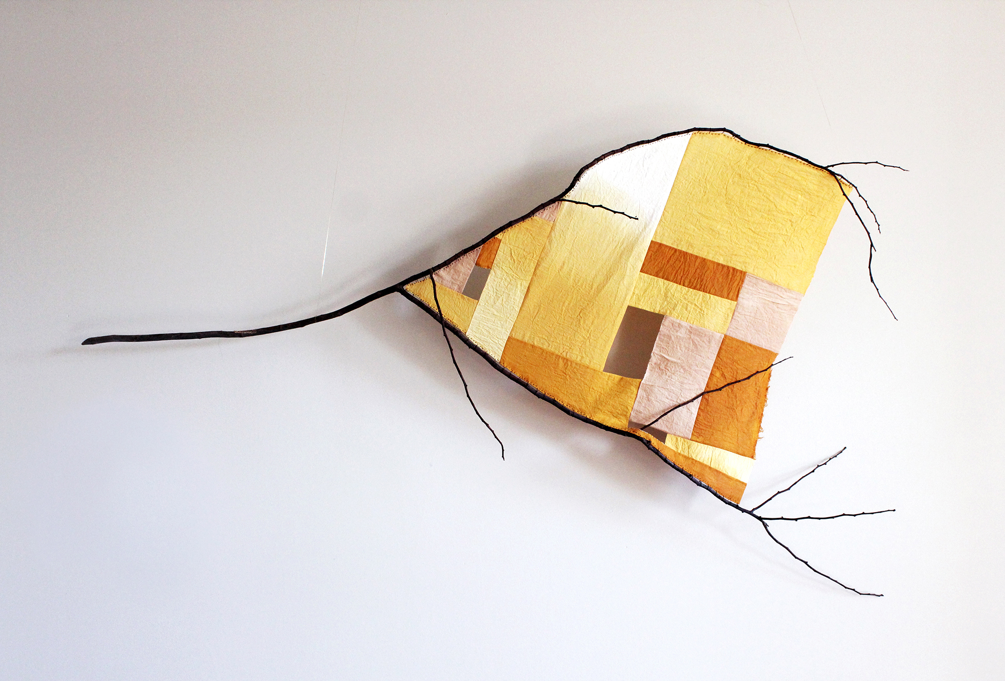 Dyed with onion and avocado skins collected between 2019-2022, this piece consists of a Japanese quince branch found on the streets of Brooklyn, NY and scrap fabric from Philadelphia. It is an active attempt at bridging a physical gap during my life, when I moved from New York to Philadelphia, through small, simple piecing that in turn capture the ephemeral yet constant presence of the sky.